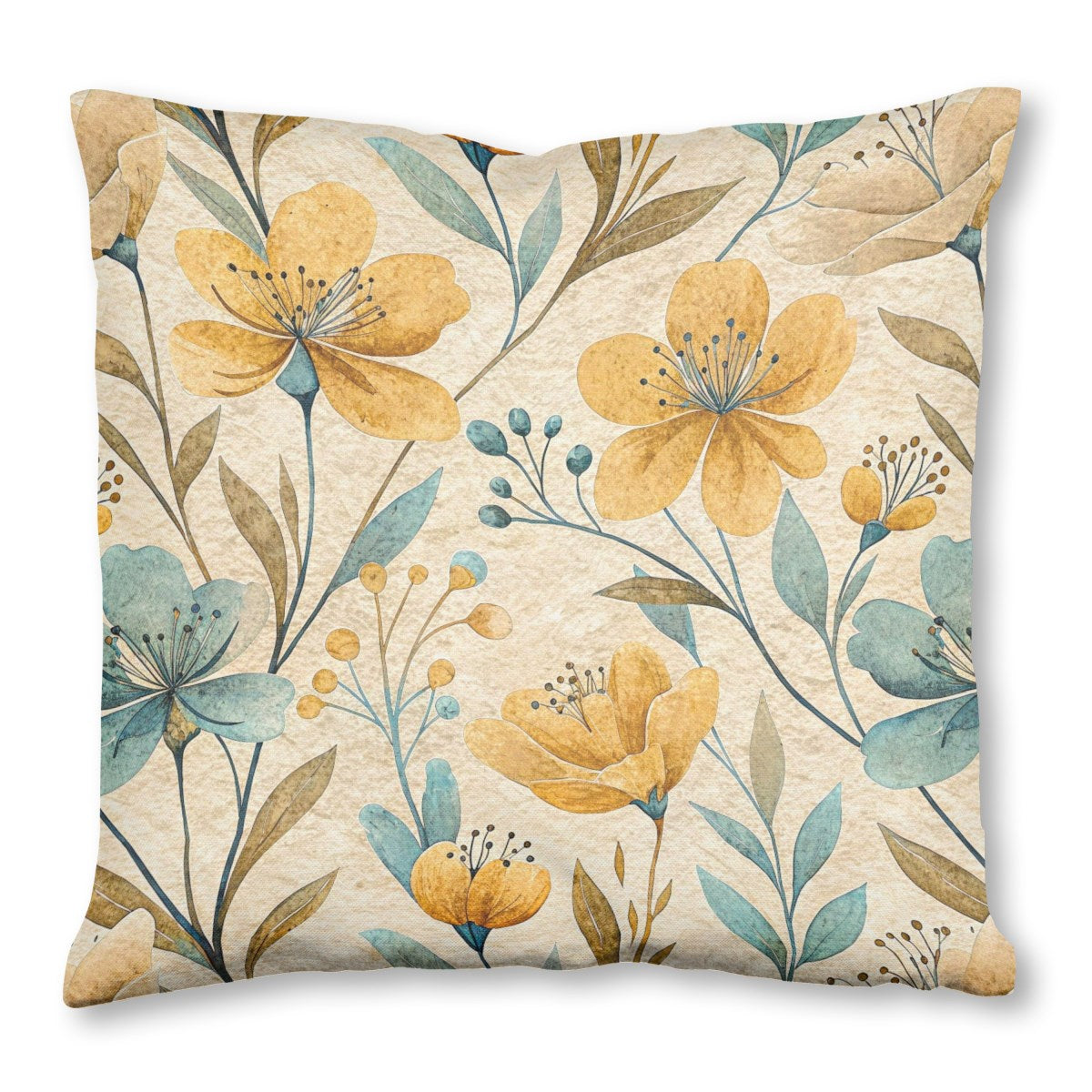 A rustic, watercolor-style floral pattern with a vintage feel. The design features stylized golden-yellow and dusty-blue flowers with delicate leaves and stems in earthy tones, all set against a textured, light beige background.