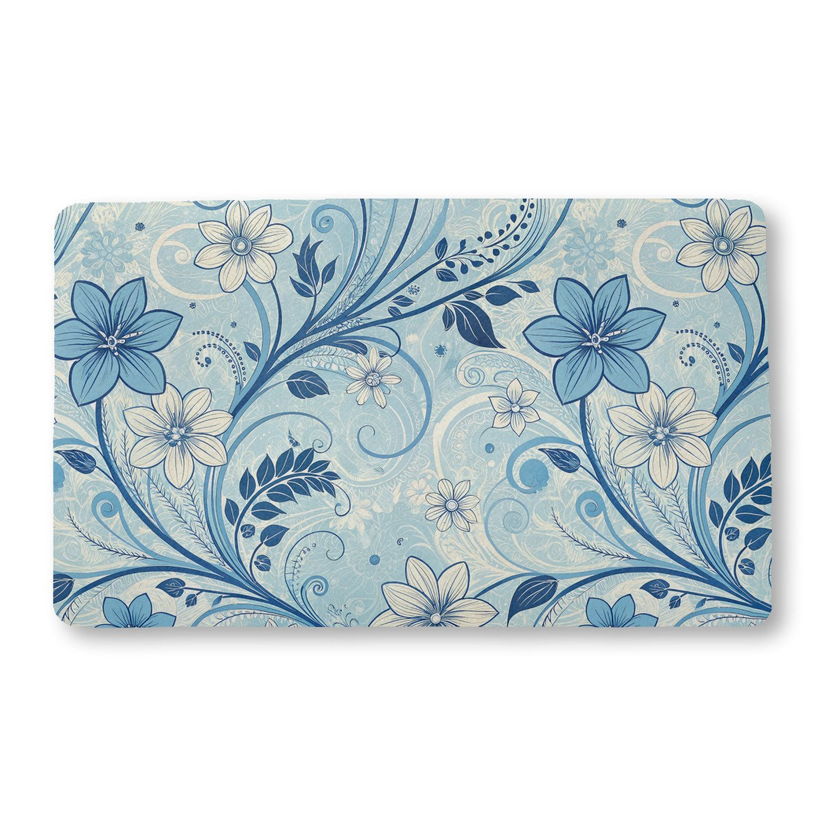 An elegant, seamless pattern of stylized flowers and swirling vines. The intricate design features a classic color palette of blue, navy, and cream against a light blue background, creating a delicate and decorative composition.
