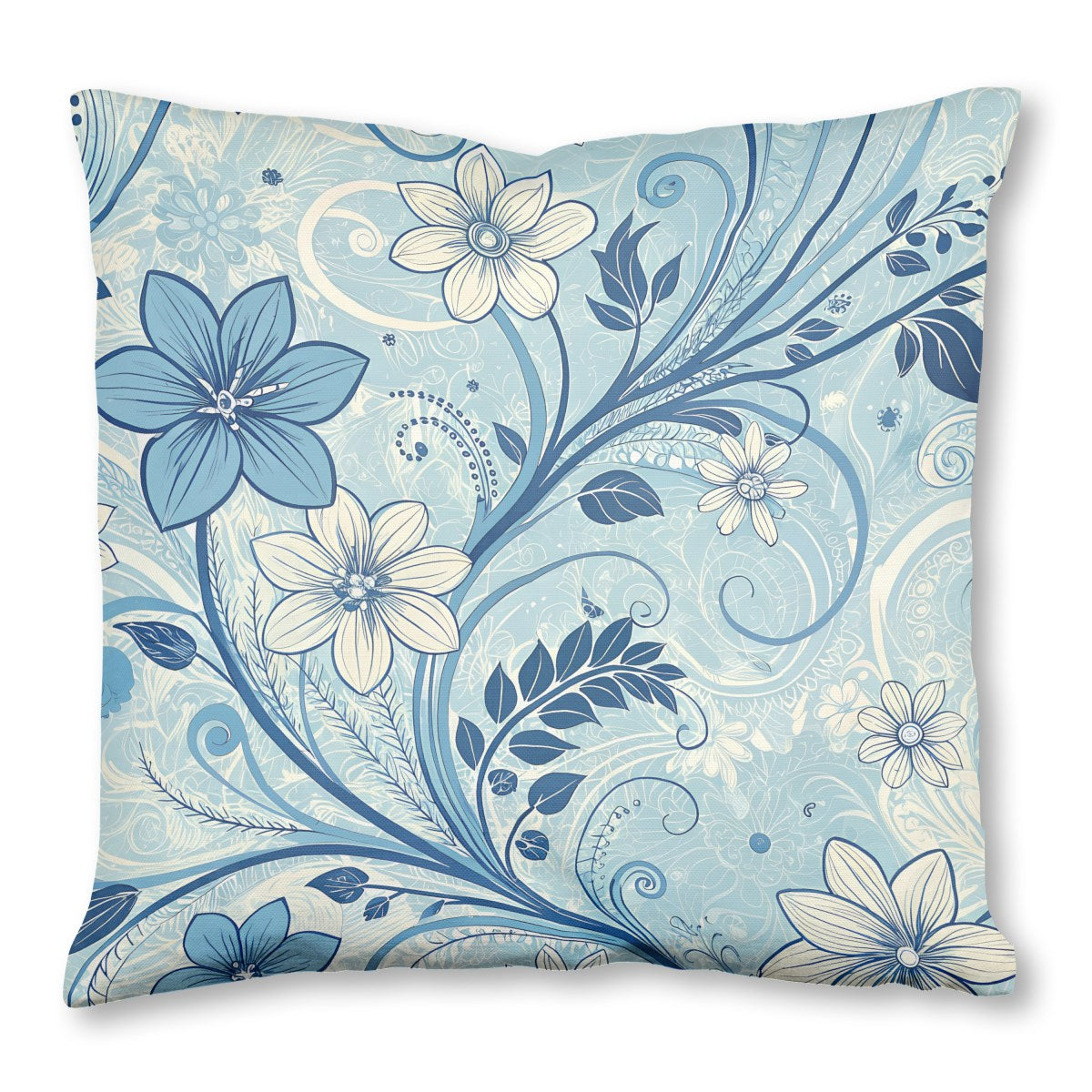 An elegant, seamless pattern of stylized flowers and swirling vines. The intricate design features a classic color palette of blue, navy, and cream against a light blue background, creating a delicate and decorative composition.