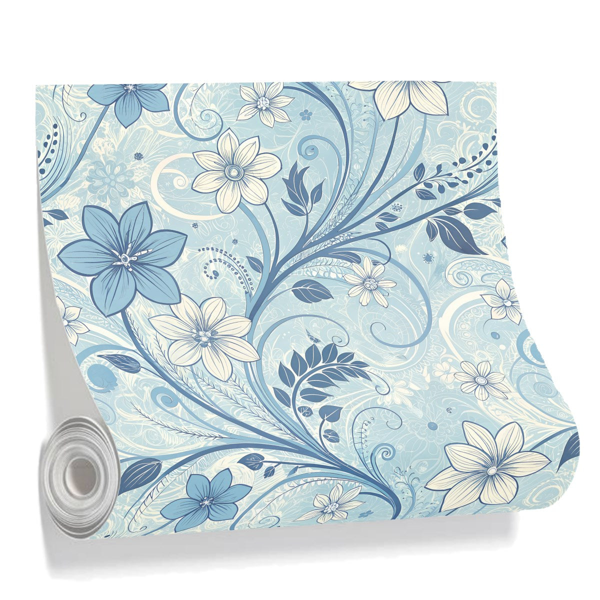 An elegant, seamless pattern of stylized flowers and swirling vines. The intricate design features a classic color palette of blue, navy, and cream against a light blue background, creating a delicate and decorative composition.