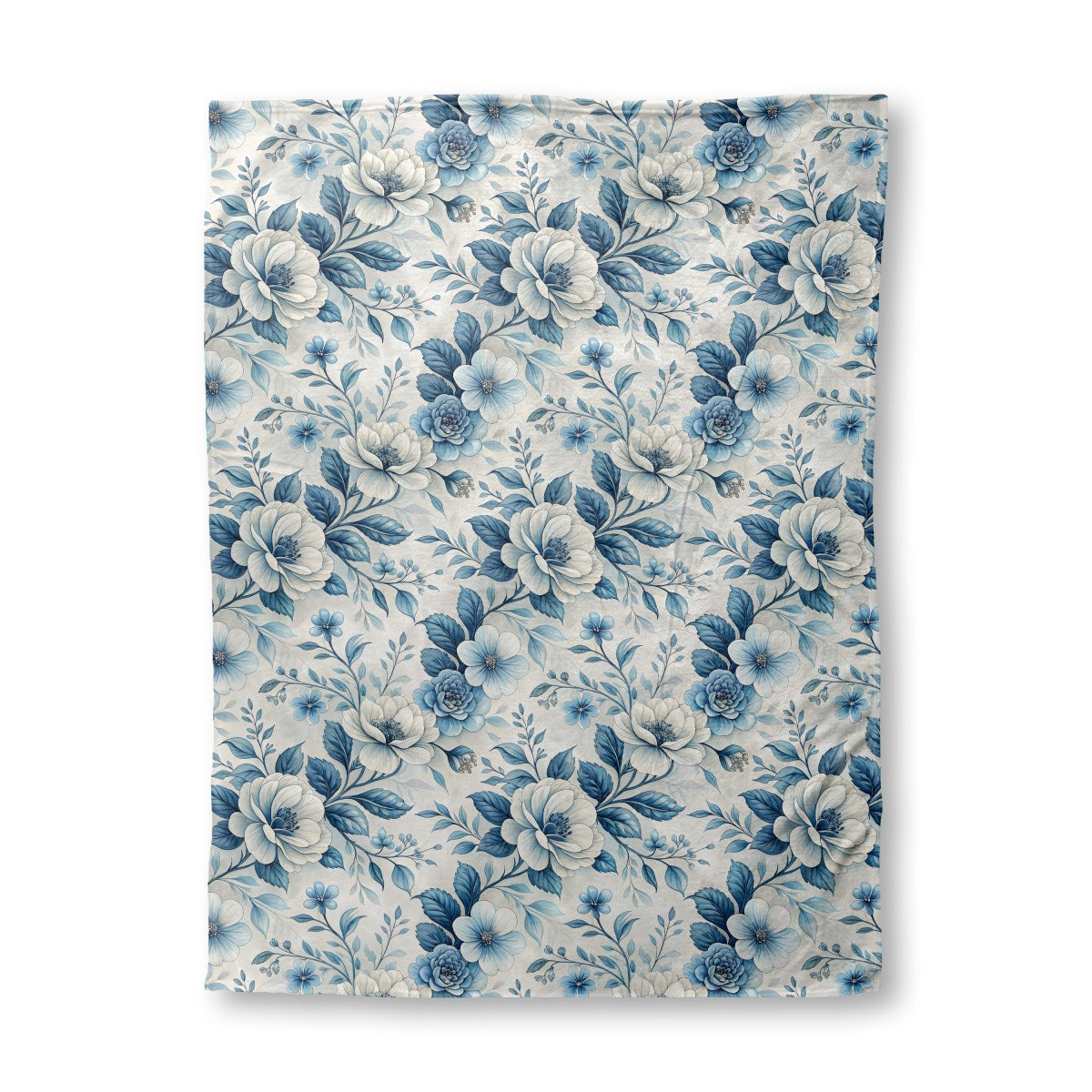 This is an elegant seamless pattern of blue and white flowers. Rendered in a delicate, watercolor-like style, the blossoms and dark blue leaves are set against a light, textured background, creating a classic and serene botanical design.