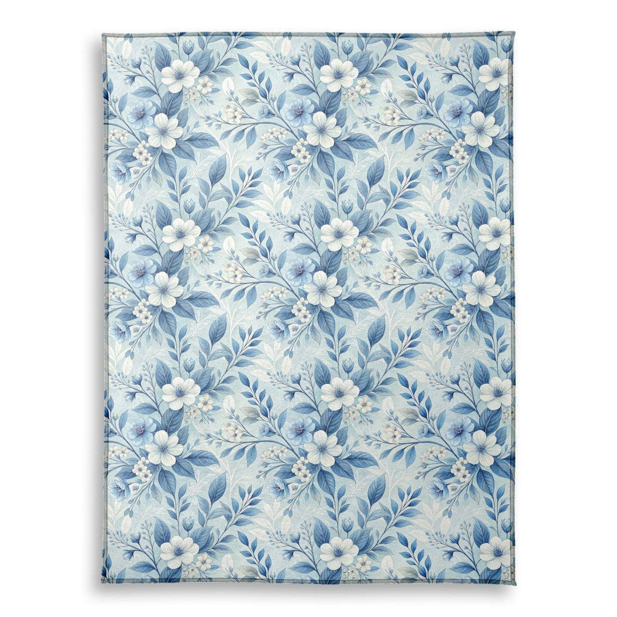 An elegant floral pattern featuring intricate white and blue blossoms with deep blue leaves. The delicate arrangement is set against a soft, textured, light blue background, creating a serene and classic design with a watercolor-like feel.