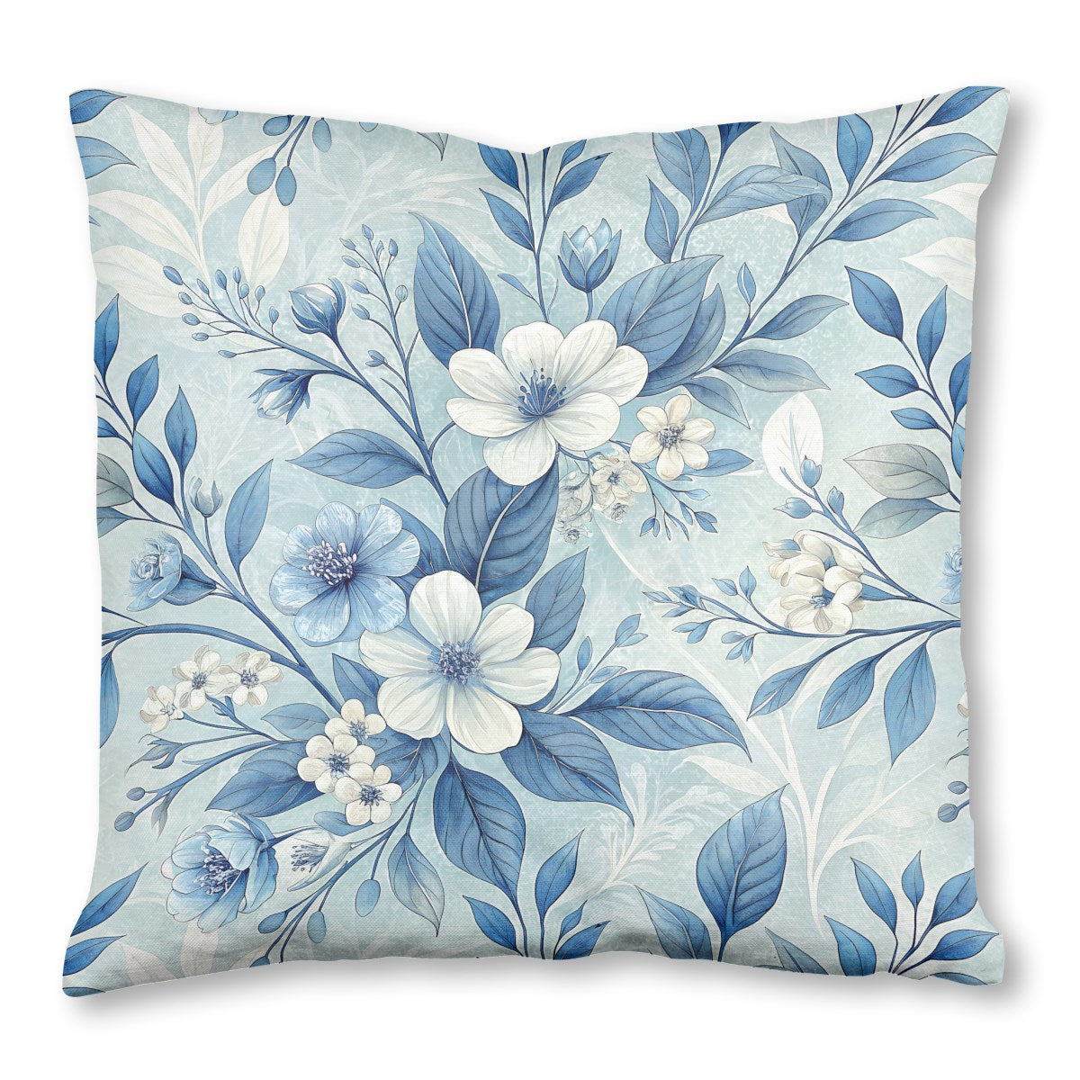 An elegant floral pattern featuring intricate white and blue blossoms with deep blue leaves. The delicate arrangement is set against a soft, textured, light blue background, creating a serene and classic design with a watercolor-like feel.
