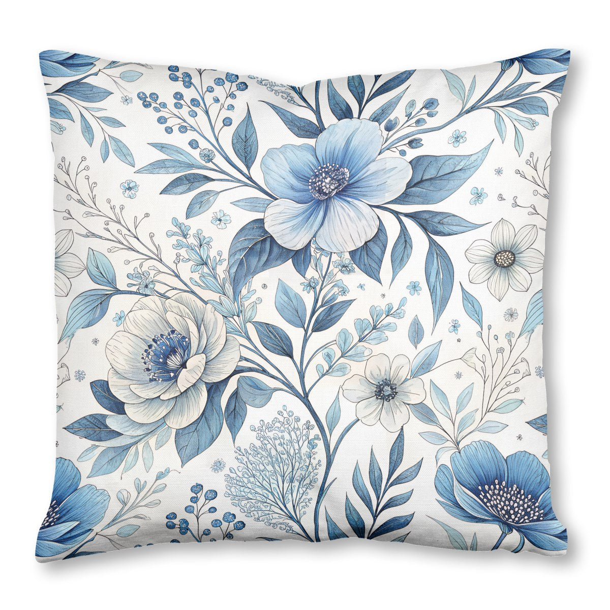 This is a delicate and intricate floral pattern featuring blue and white flowers, leaves, and berries. Rendered in a watercolor and ink-line style against a white background, the design creates a timeless and elegant botanical illustration.
