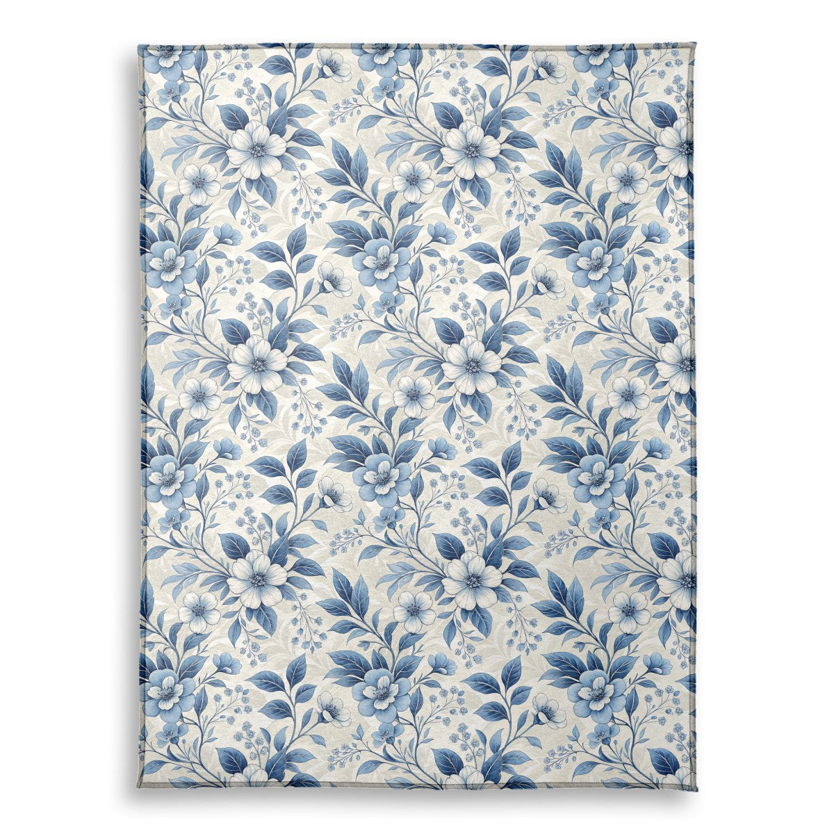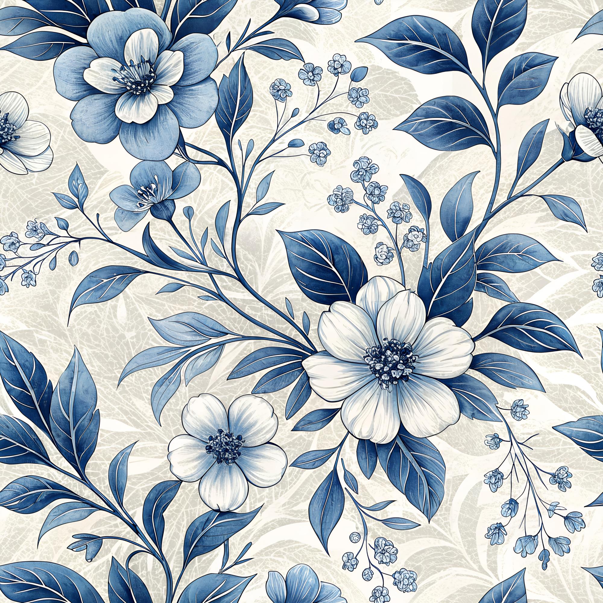 This is an elegant, seamless floral pattern in a classic blue and white palette. Intricately drawn flowers and leaves intertwine over a light, textured background, creating a timeless design reminiscent of vintage botanical illustrations or fine porcelain.