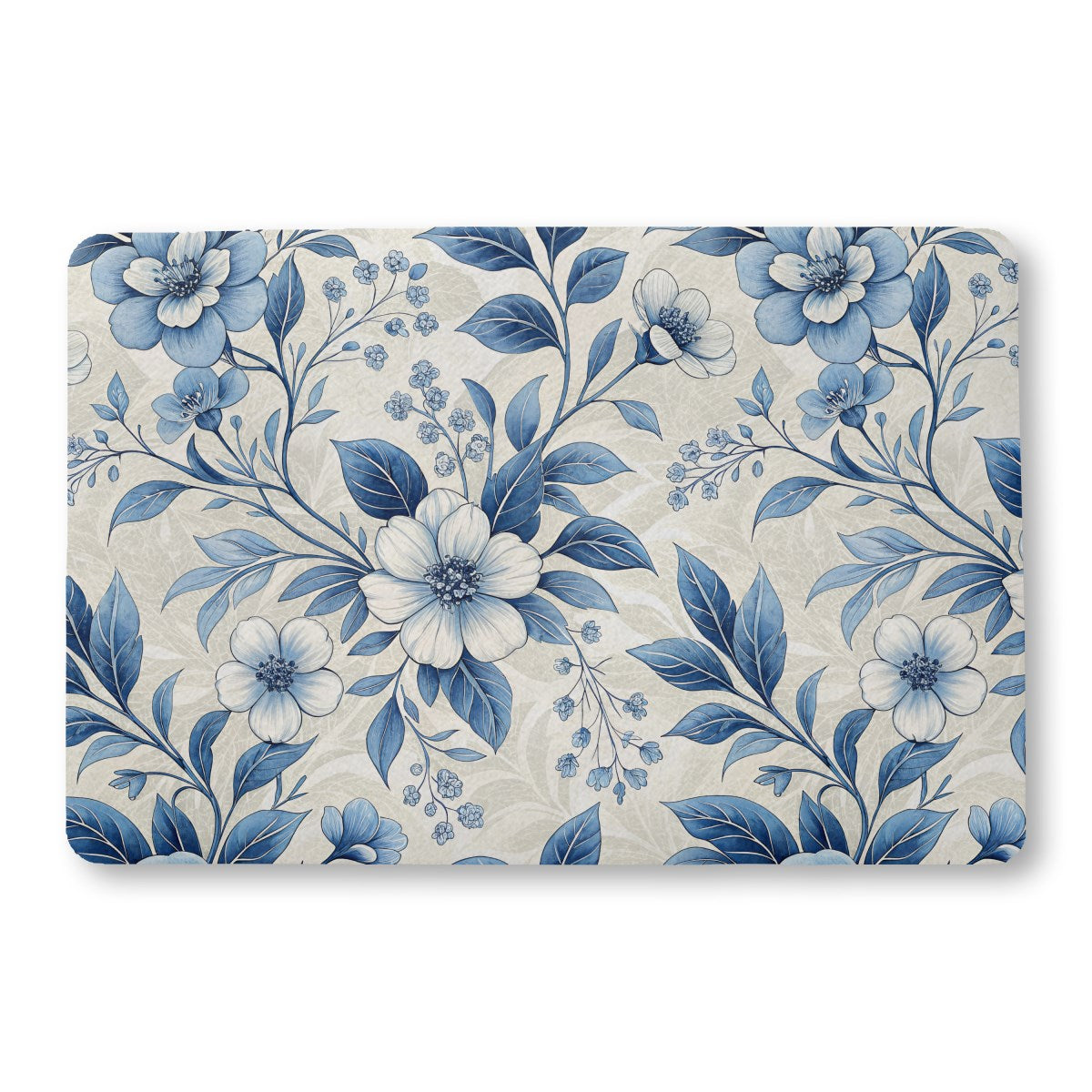 This is an elegant, seamless floral pattern in a classic blue and white palette. Intricately drawn flowers and leaves intertwine over a light, textured background, creating a timeless design reminiscent of vintage botanical illustrations or fine porcelain.