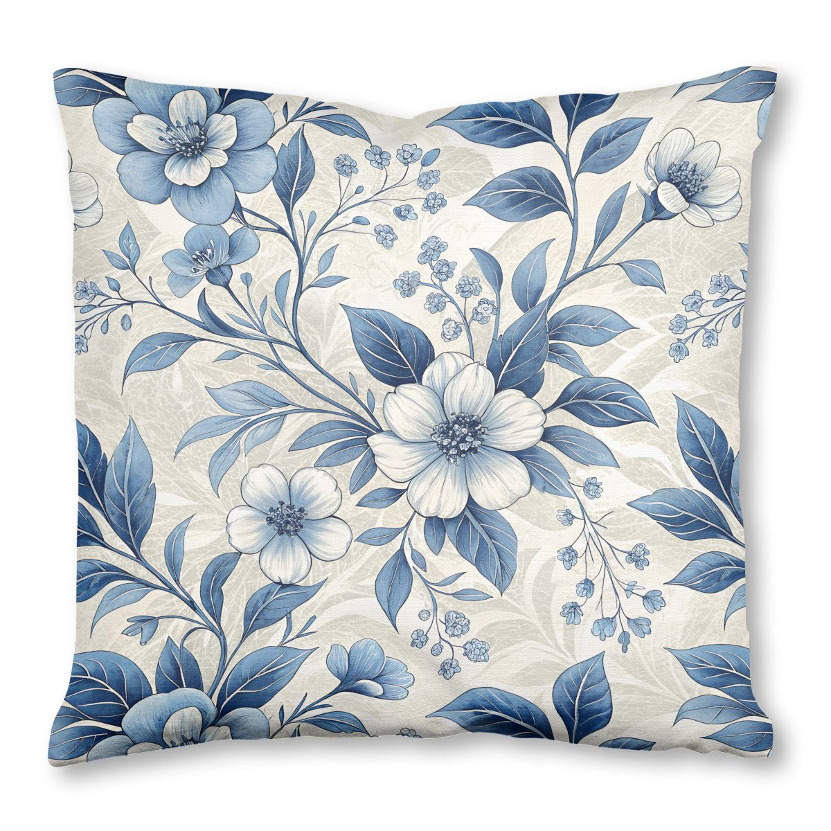 This is an elegant, seamless floral pattern in a classic blue and white palette. Intricately drawn flowers and leaves intertwine over a light, textured background, creating a timeless design reminiscent of vintage botanical illustrations or fine porcelain.