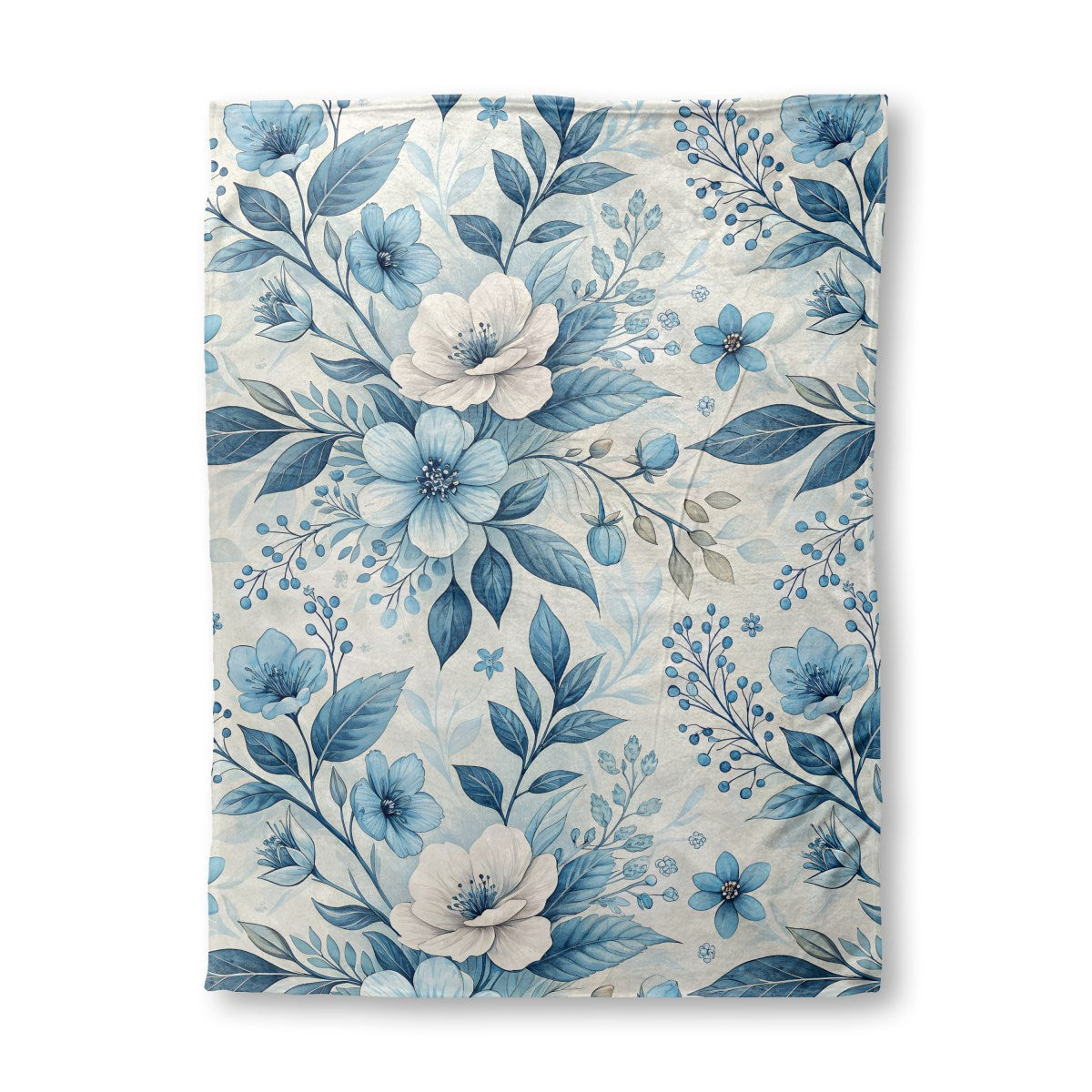 An elegant watercolor-style illustration of a floral pattern. The serene composition features delicate blue and white flowers, deep blue leaves, and small berries intertwined on a light, textured background, creating a classic and tranquil design.