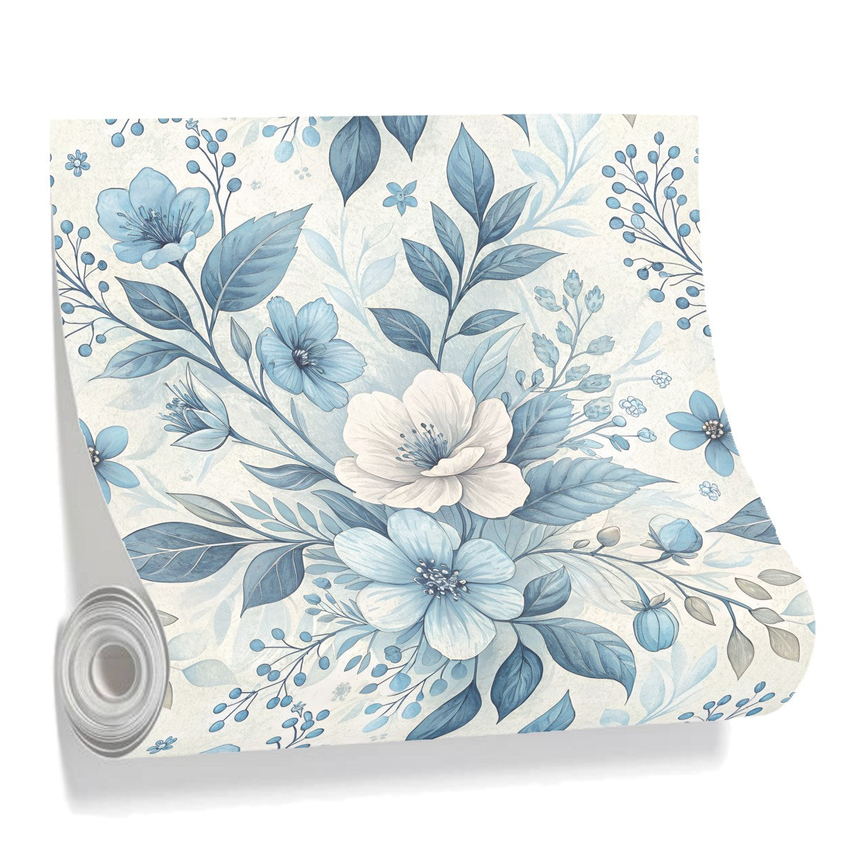An elegant watercolor-style illustration of a floral pattern. The serene composition features delicate blue and white flowers, deep blue leaves, and small berries intertwined on a light, textured background, creating a classic and tranquil design.