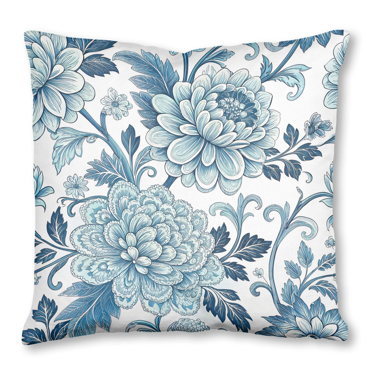 An elegant, seamless floral pattern in shades of blue on a white background. The design features large, stylized peonies or chrysanthemums with intricate linework, interwoven with scrolling vines and leaves, creating a classic, decorative look reminiscent of traditional porcelain.