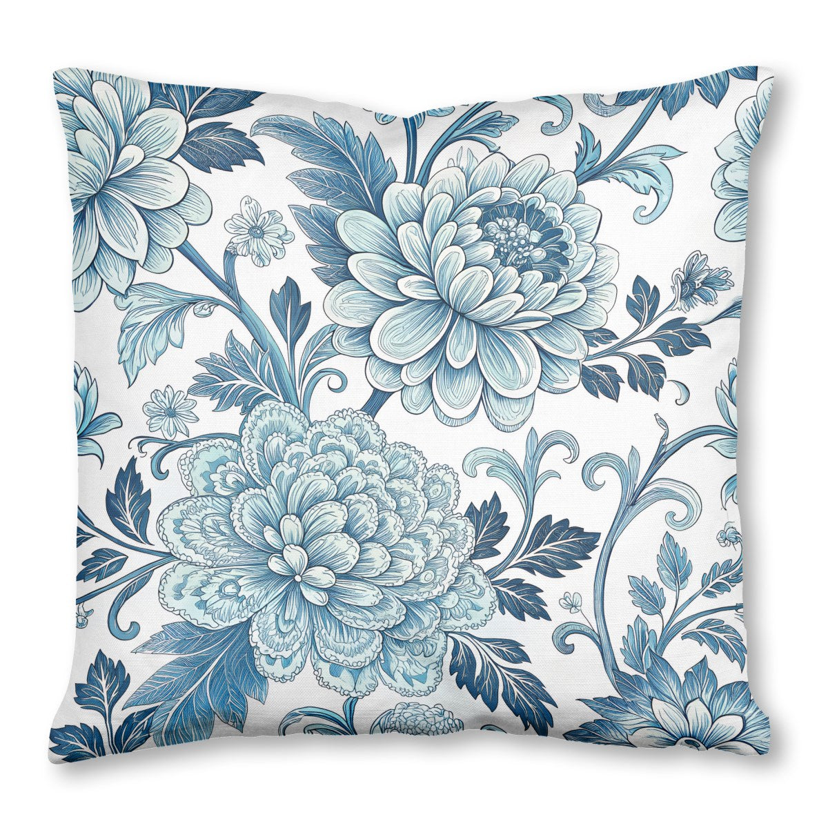 An elegant, seamless floral pattern in shades of blue on a white background. The design features large, stylized peonies or chrysanthemums with intricate linework, interwoven with scrolling vines and leaves, creating a classic, decorative look reminiscent of traditional porcelain.
