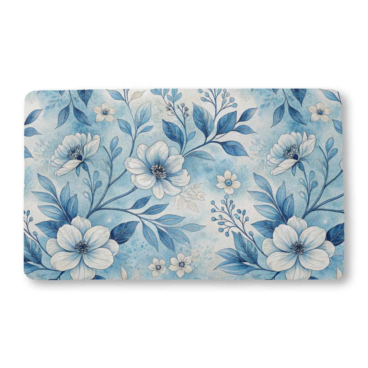 This watercolor illustration depicts a delicate floral pattern. White flowers with dark centers and deep blue leaves are intertwined on winding stems. The composition is set against a soft, mottled light blue background, creating a serene and elegant design.