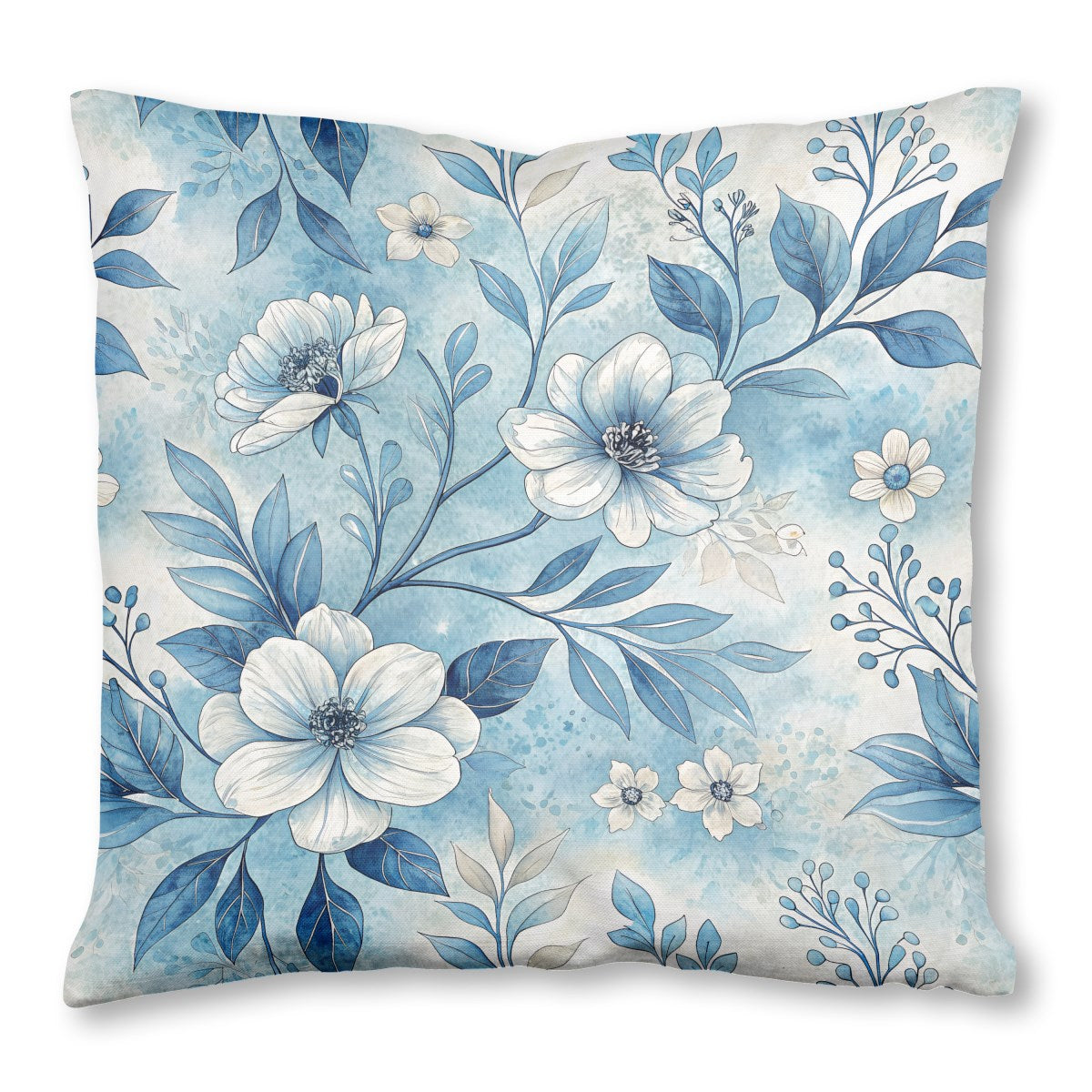This watercolor illustration depicts a delicate floral pattern. White flowers with dark centers and deep blue leaves are intertwined on winding stems. The composition is set against a soft, mottled light blue background, creating a serene and elegant design.