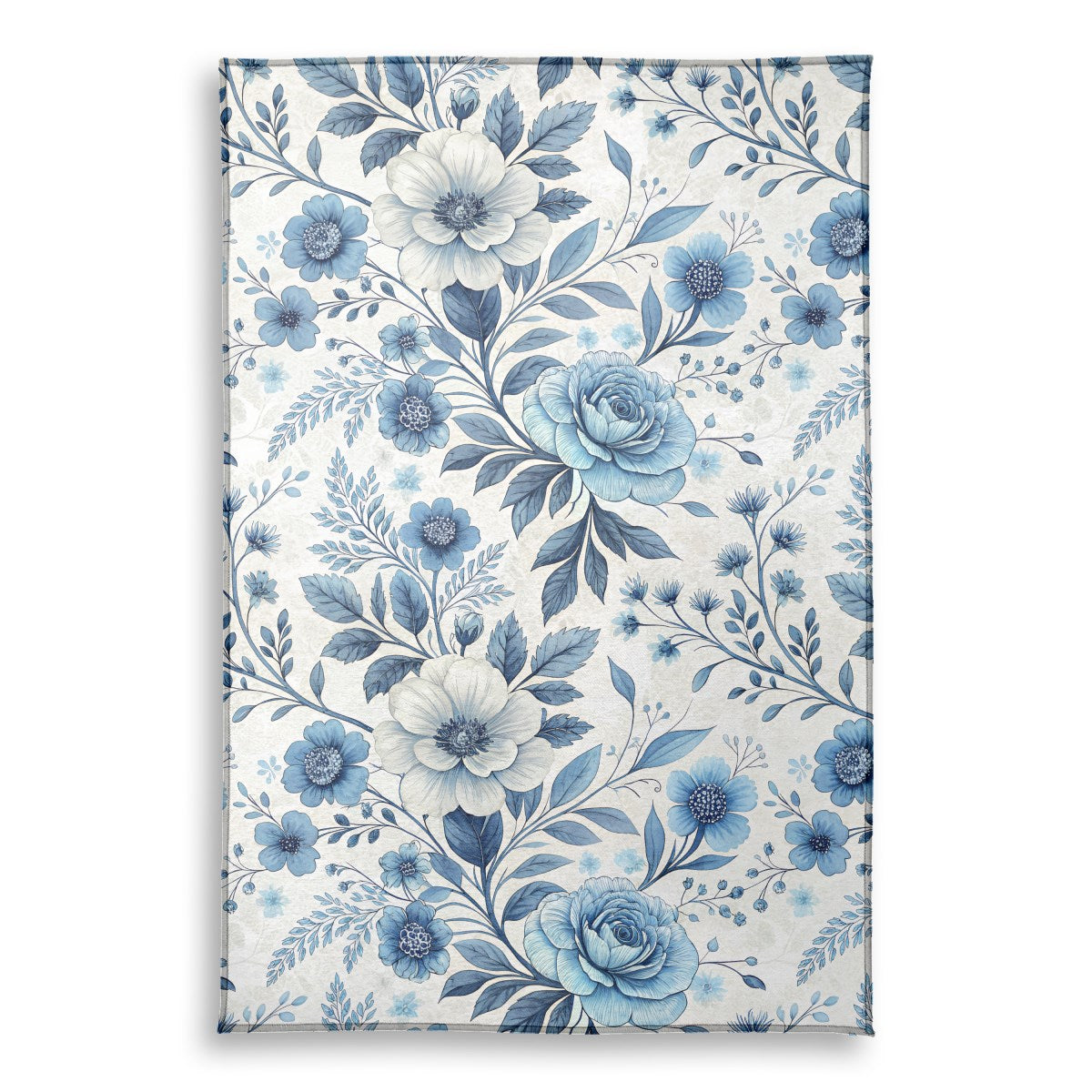 This is an elegant, seamless floral pattern featuring intricate blue and white flowers and leaves. Rendered in a delicate, watercolor or ink-wash style on a light, textured background, the design evokes the classic beauty of porcelain or fine textiles.
