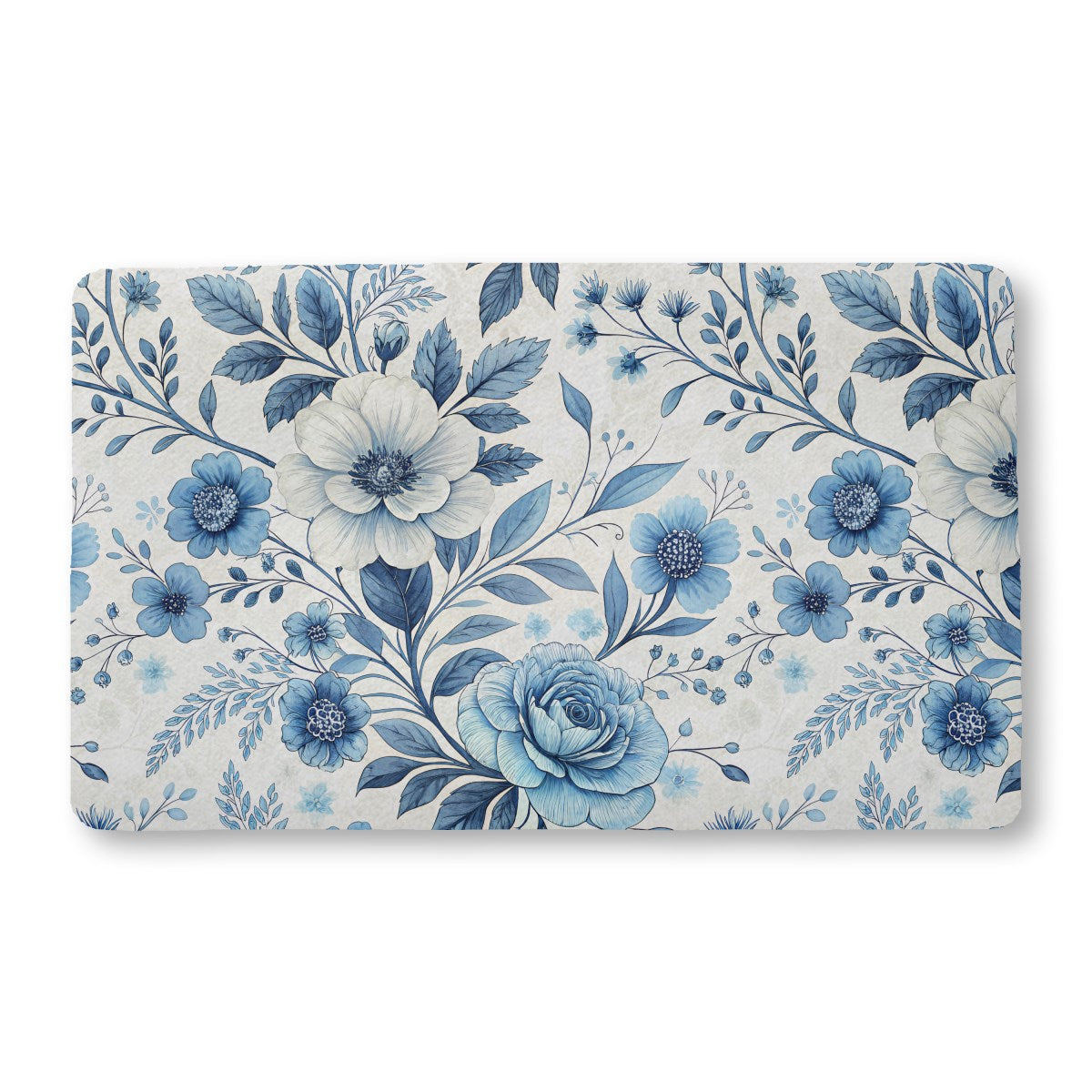 This is an elegant, seamless floral pattern featuring intricate blue and white flowers and leaves. Rendered in a delicate, watercolor or ink-wash style on a light, textured background, the design evokes the classic beauty of porcelain or fine textiles.